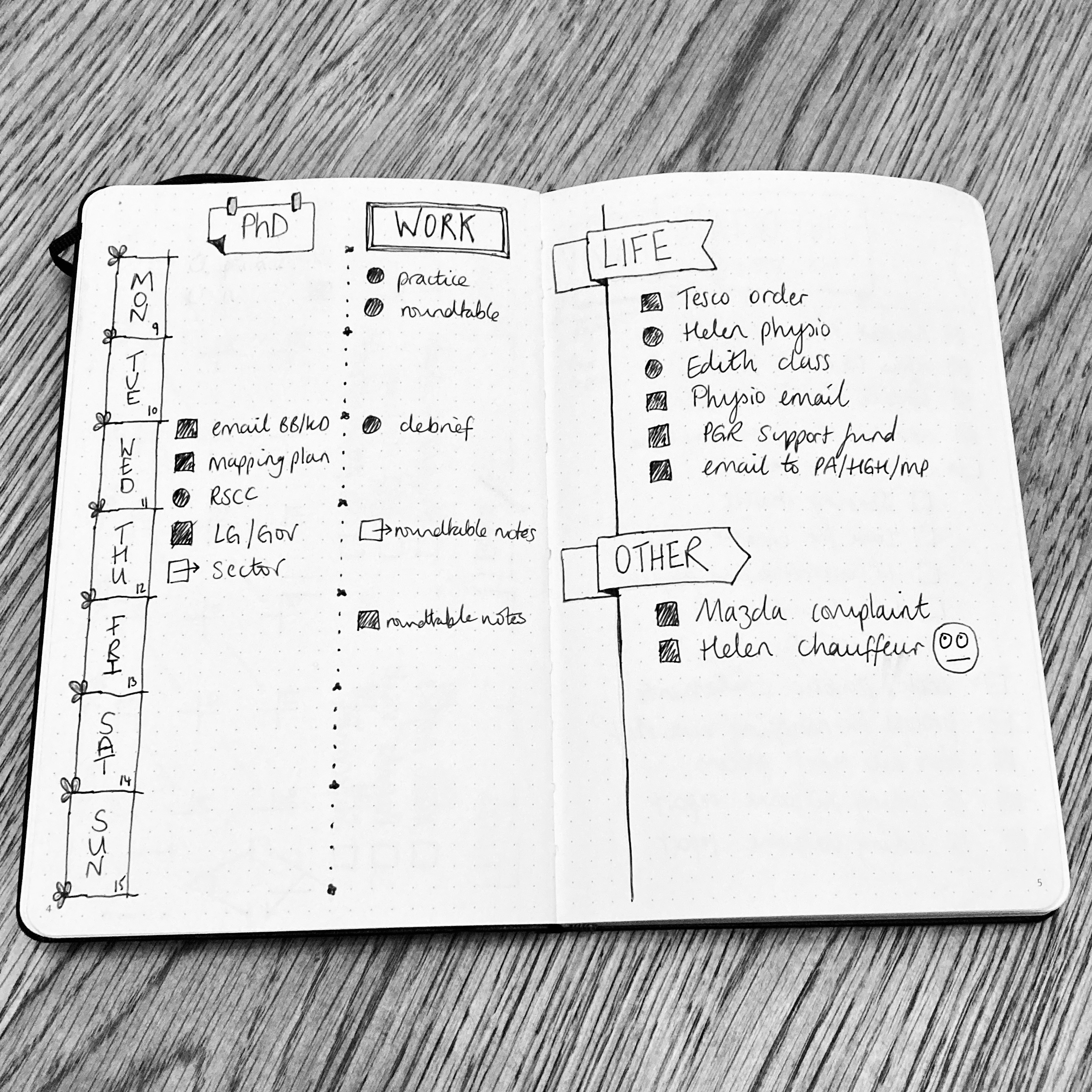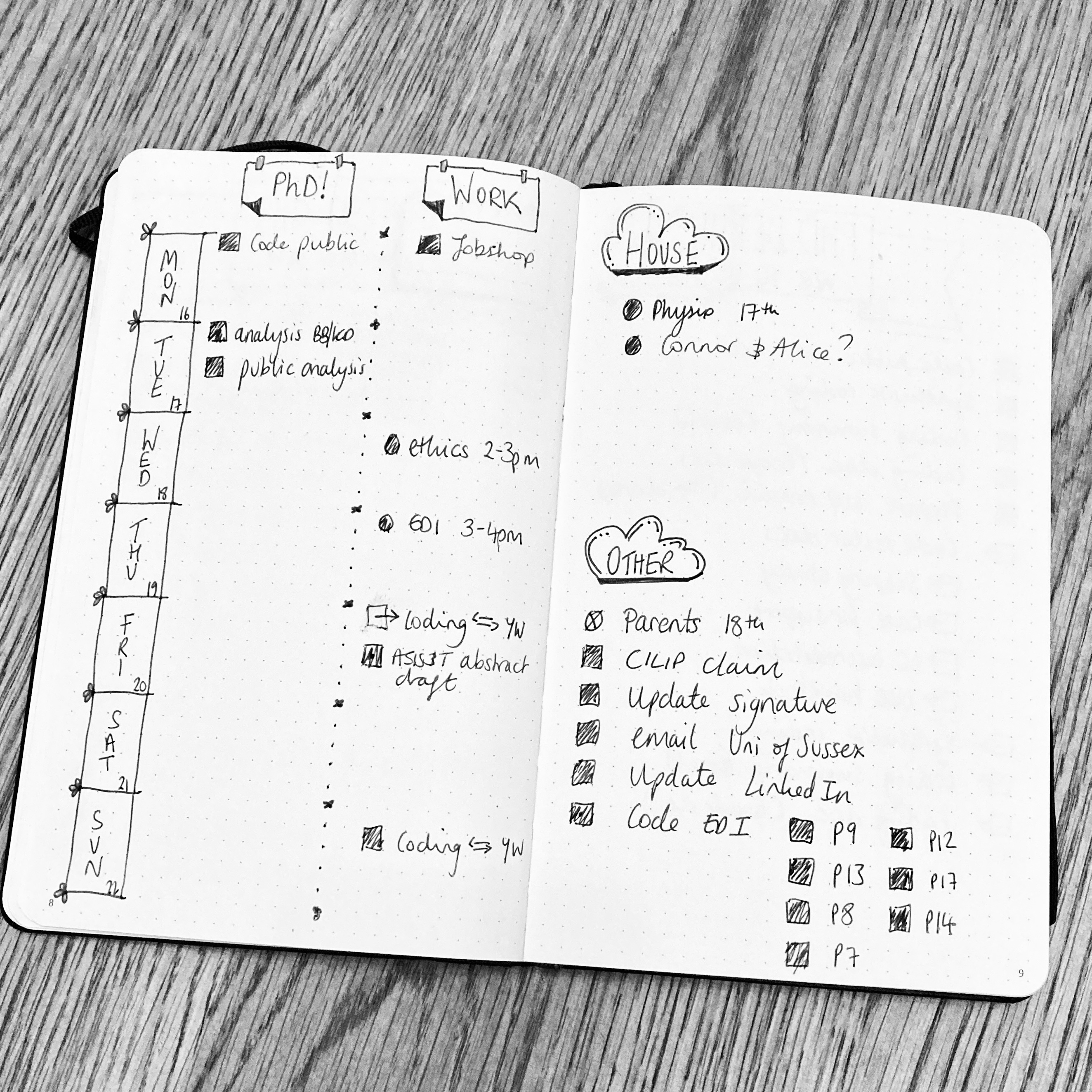 In the last week, I’ve also refound my PhD stride. I’m back with my chums on PhD Forum (link) more often, when meetings allow. Also, I’ve gone back to old school methods and reinstated my bullet journal. It’s a really simple but effective way of organising the noise in my head, particularly when I’m juggling multiple things. Essentially, there are official rules you can check out online (link) but my system is simple: