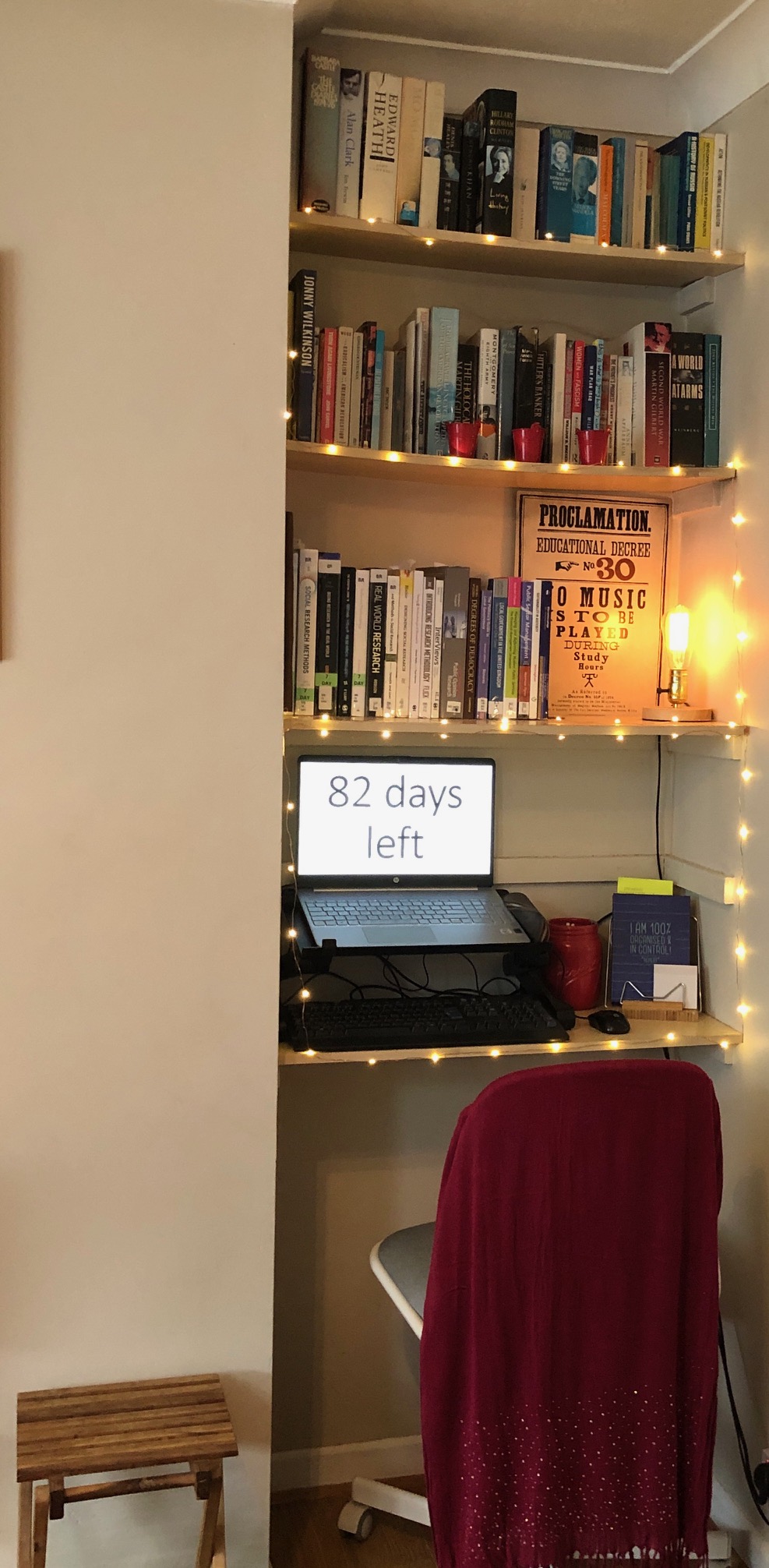 I have reconfigured a corner of our lounge. I now have a chair, foot rest, side table, desk, elevated laptop, book stand, lighting, Harry Potter themed items and my library books. Literally, my library books as I can’t return them to either library at the moment. I’ve tested it out today and it seems to be a productive and plausible space to work. I’m fortunate that my wife has offered to take the bulk of the puppy duties to enable me to catch up. Also, as we now eat at 7 p.m. (ish) and do family things from 8 p.m., it means there’s a natural cut off for using the space.