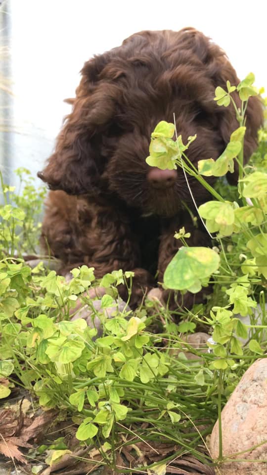 At the breeder’s home.Ewok.Green eyes.In the clover.Furry Guinea Pig impression.It’s lucky she’s so cute…