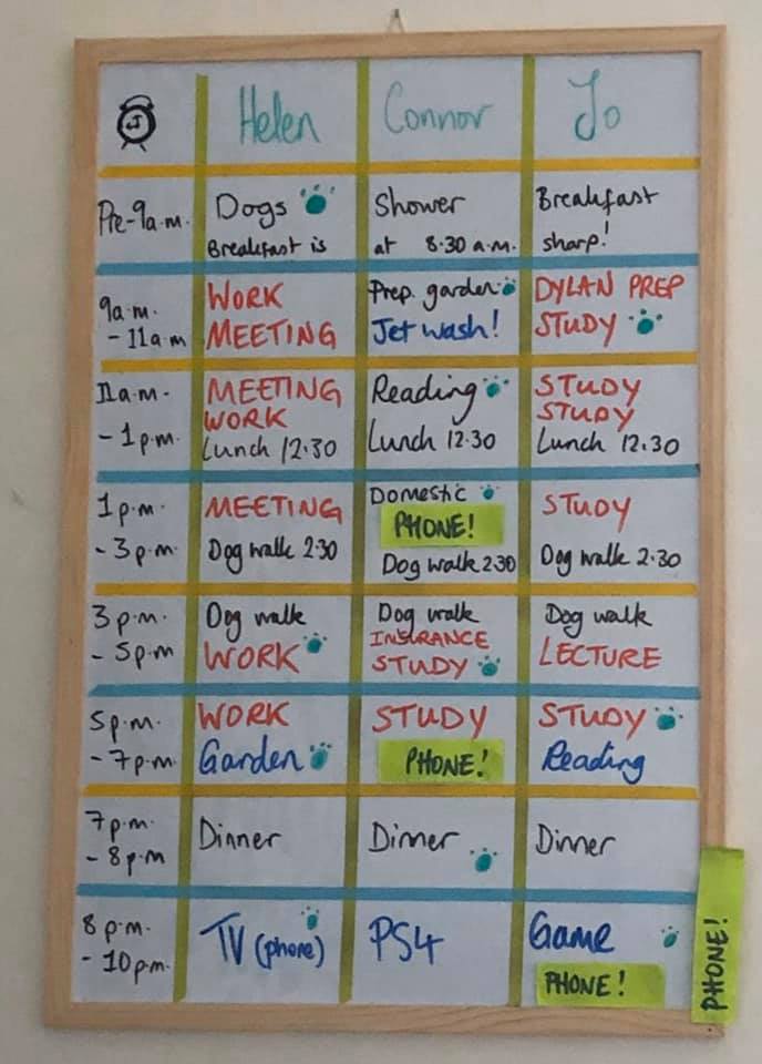 The puppy is sly and we quickly had to amend the schedule to make it very clear who had responsibility for her (green paw symbol). Otherwise, she had started to chew wires, eat poop (a habit we had been reducing) and generally cause mayhem. We also limited phone time (I mentioned this in the last blog post). Sofa: I’m still sleeping on it. Turns out that helps for social distancing, too.