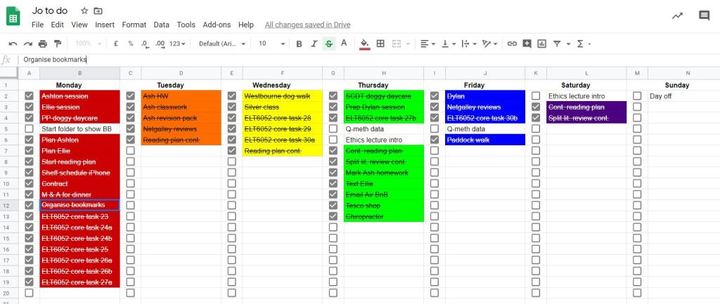 To tackle sense of being lost, I’ve started to use more organising functions to keep on track of information, ideas and messages: sub-folders within my internet bookmarks, Google Workspaces on my Google Drive, bookmarking on Twitter when I see something of note, a to-be-read document of materials I’ve encountered but haven’t yet had time to deal with, more sub-folders with my emails and an interactive, prettified to-do list on a Google Sheets.