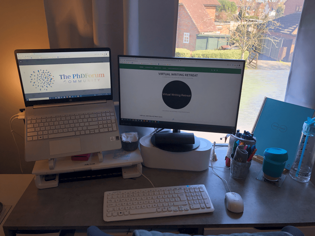 It transpired that emulating these features of my previous flexible routine did nothing to help with my motivation and efficacy. Honestly, it was confusing and frustrating. Then, in August, as I was limping towards my first year PhD deadline, I attended an online session called Thesis Writing Workshop led by Dr Esther Allen – Research Development Manager for the Faculty of Social Sciences at the University of Sheffield. I was hoping to pick up some tips and tricks for academic writing at this level. Esther’s content was excellent; she provided a lot of help and guidance for those of us who procrastinate, including exploring the reasons behind it. She also talked about writing retreats… I’d previously seen them advertised at the University earlier in the year but as a distance learner with nothing to write (back then), I’d assumed they weren’t relevant to me. Esther described virtual equivalents which were popping up in lieu of in-person retreats and provided some links. With a nothing-ventured-nothing-gained level of desperation, I signed up for a retreat with Virtual Writing Retreat.
