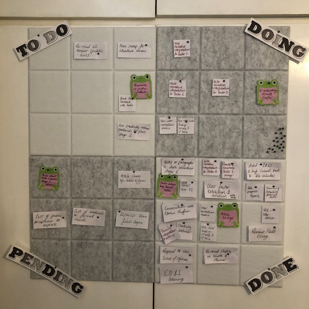 Around the same time, I started a Kanban board to organise my PhDing so I also grabbed some frog notelets to indicate those kinds of tasks. If I recall, this caused another study buddy to start a similar search which led to some confusing and unpleasant sexy frog images.