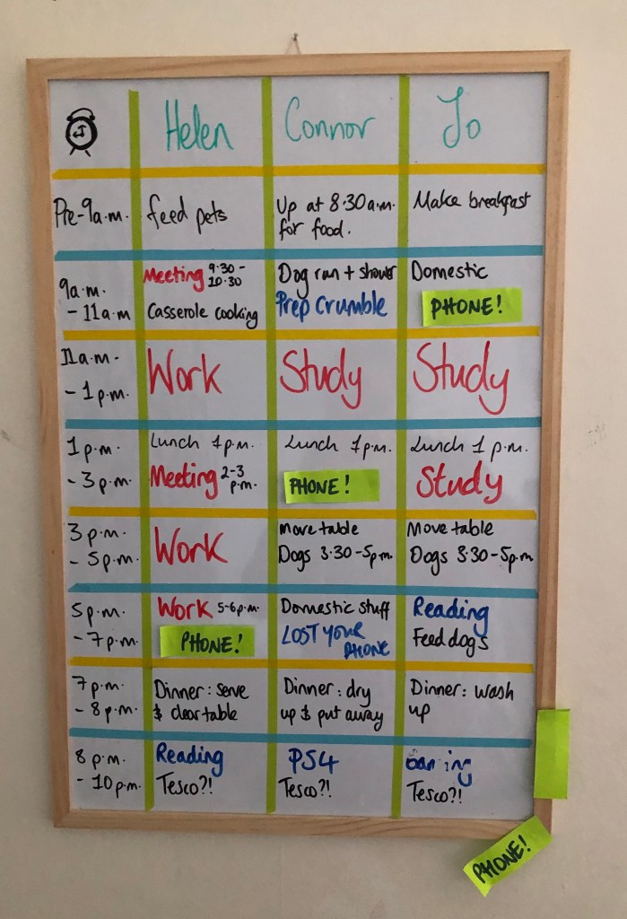 With that in mind, we’ve developed a schedule. The man-child wants fun things to do, my wife and I want to be able to maintain our workloads, the pets need entertainment and I am adamant that we are not all just going to be glued to our screens 24/7. In fact, I’ve found that my wife becomes a poor communicator and lethargic if she spends too much time scrolling through Twitter and the news, the man-child actually becomes unbearable moody and verbally aggressive (not his normal traits) and I recognise that I become unmotivated to do anything else. The result of our combination of needs is a daily schedule.